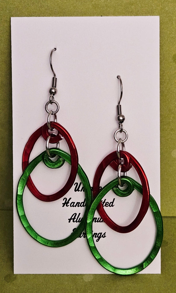 Handcrafted Holiday Earrings - Hammered Red & Green Aluminum on Surgical Steel Ear Wires